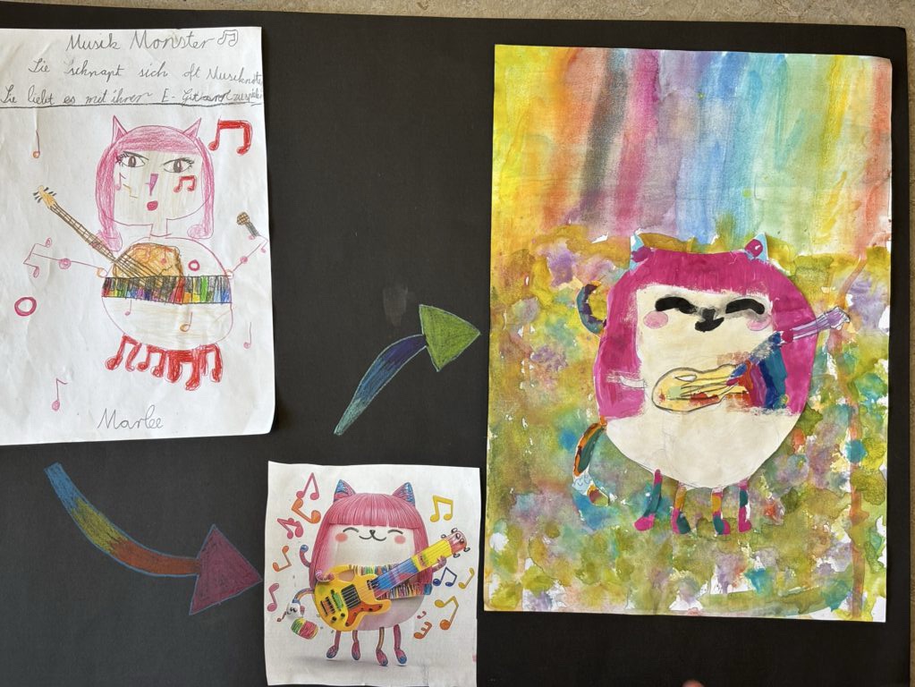 Ein anderes Kind gestaltete ein pinkhaariges Musik-Monster mit Noten auf dem Bauch und einer Gitarre in der Hand. Die KI fügte leuchtende Farben, Details und ein Lächeln hinzu. Das Kind reagierte darauf mit einer farbenfrohen, malerischen Interpretation auf Regenbogenhintergrund – eine perfekte Mischung aus Original, KI und eigener Fantasie.
