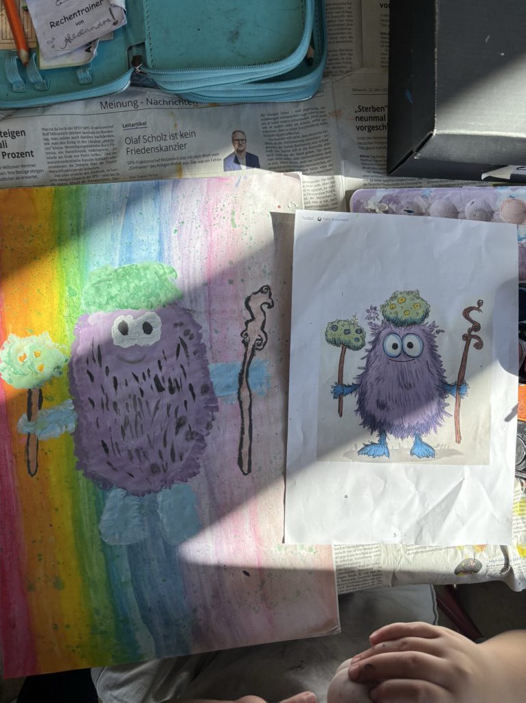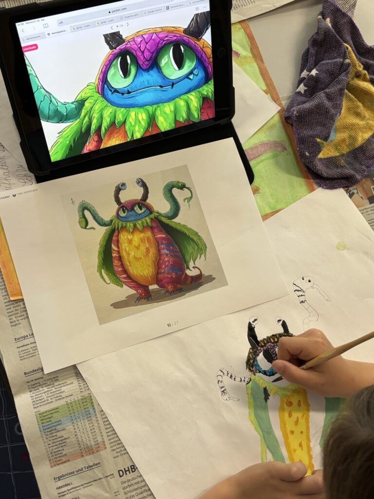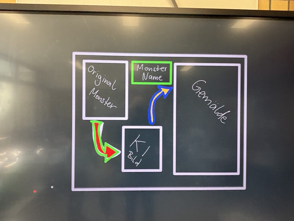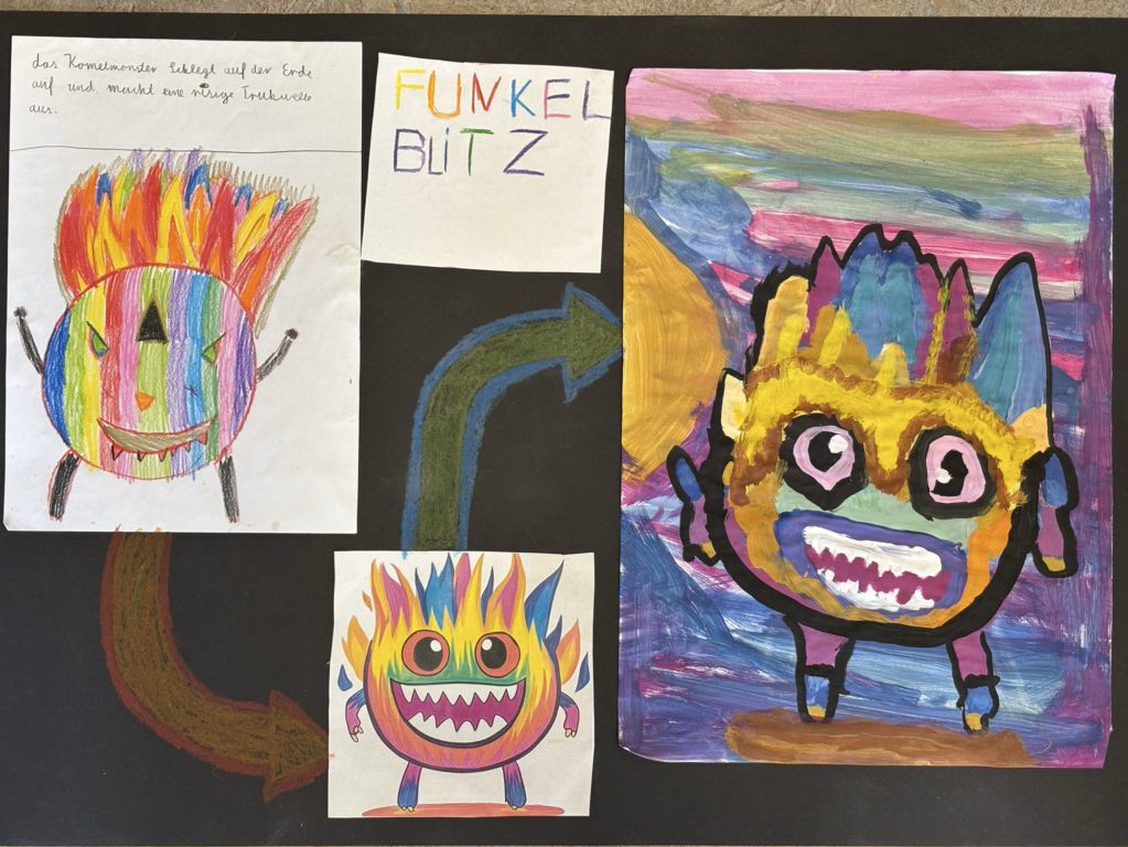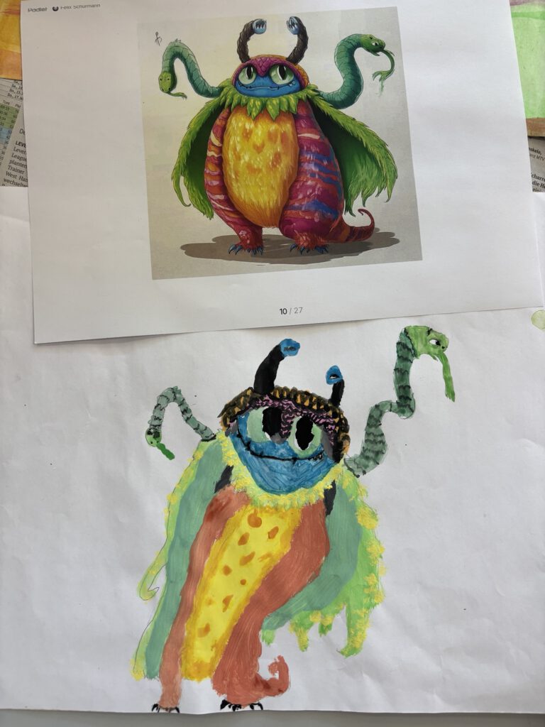 Zu Beginn malte jedes Kind sein eigenes Fantasie-Monster mit Buntstiften oder Filzstiften. Diese Originalzeichnungen wurden anschließend fotografiert und in ein KI-Tool eingespeist. Die Künstliche Intelligenz analysierte die Merkmale, Farben und Formen der Kinderzeichnungen – und erstellte daraus detailreiche, digitale Monsterbilder in völlig neuem Stil.