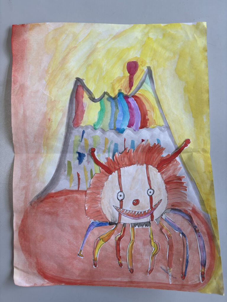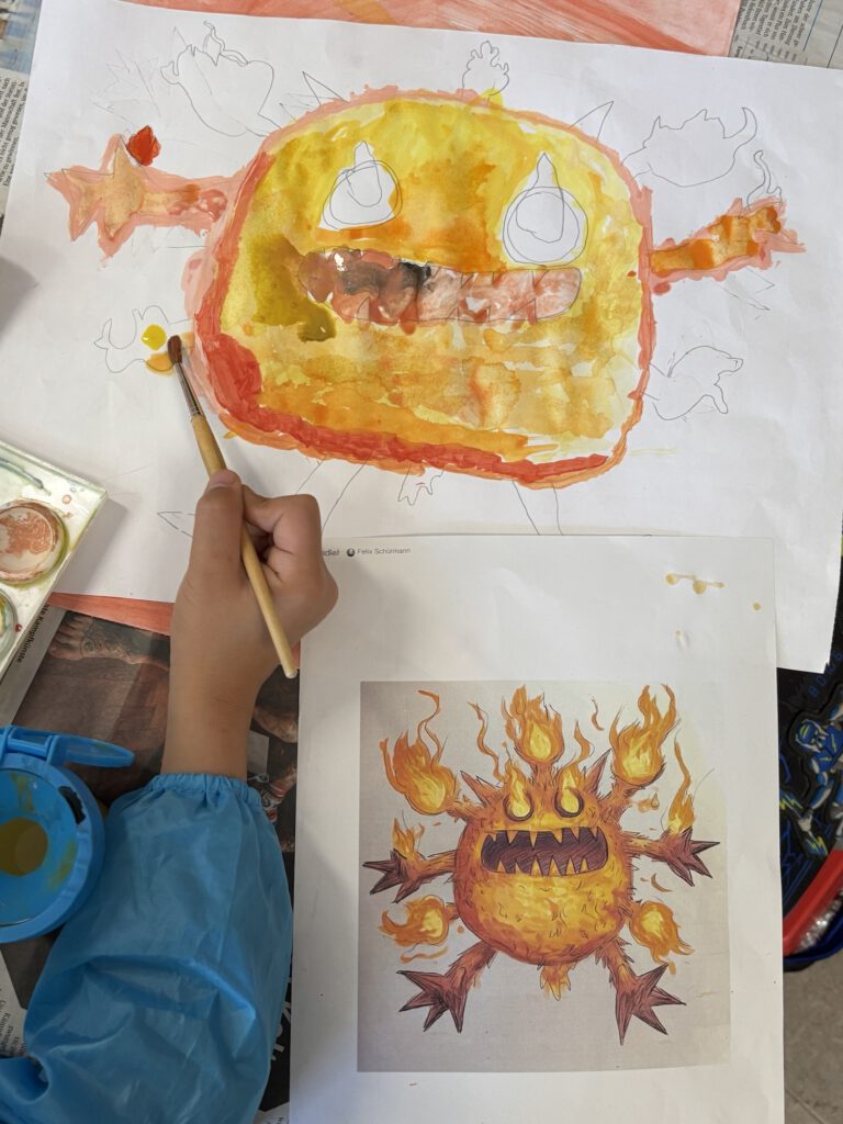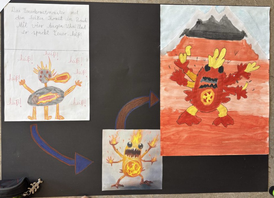 Ein Schüler malte ein feuerspeiendes Kugelmonster mit vielen Armen. Die KI verwandelte es in ein flammendes, stacheliges Wesen mit leuchtenden Feuerkrallen. Der Schüler ließ sich davon inspirieren und malte sein Monster erneut – diesmal mit Aquarellfarben, glühender Lava im Hintergrund und scharfem Farbkontrast.